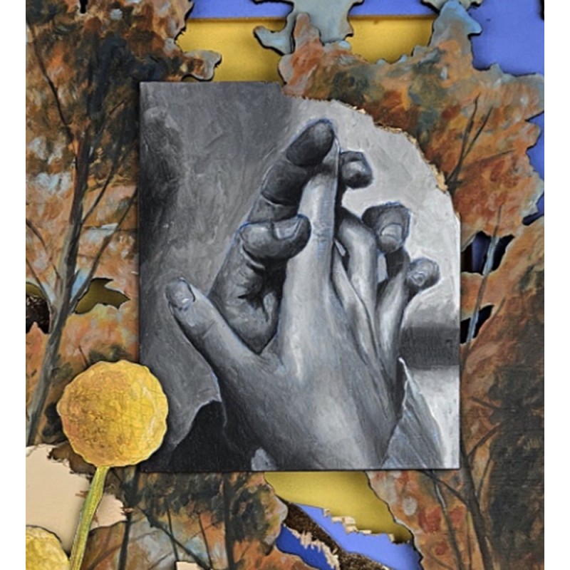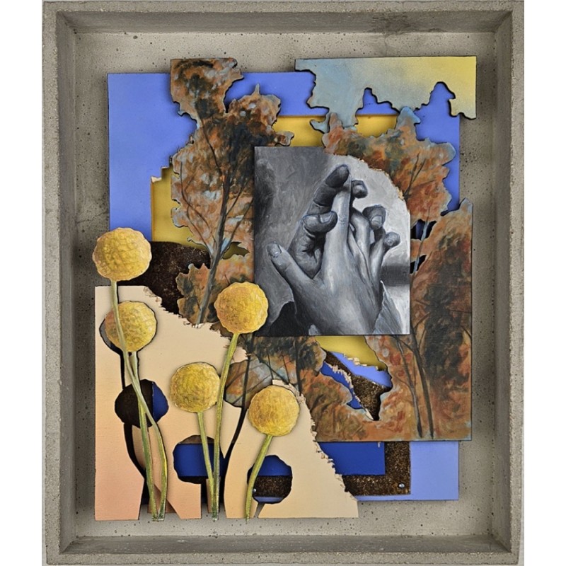Technique mixte : acrylique, mine de plomb, collage, bois, béton