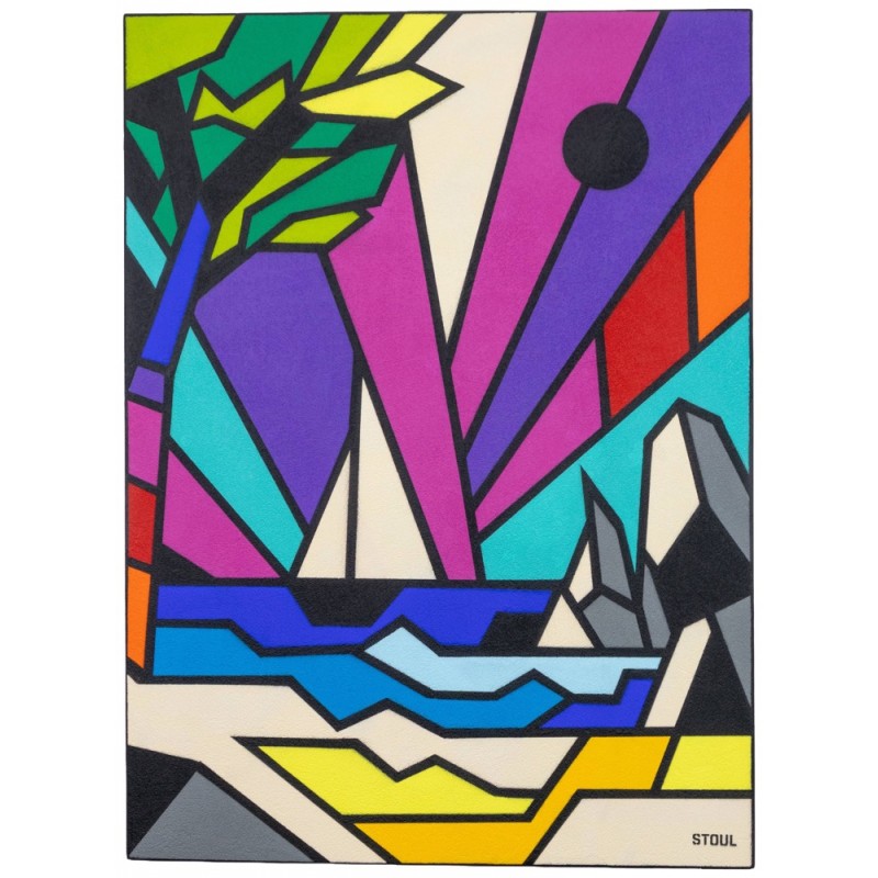 « Destination Plage » Avec cette série, Stoul explore des paysages de bord de mer en fragments abstraits. Chaque œuvre évoque une sensation estivale : rochers, dunes, blockhaus, soleil couchant... À travers son style géométrique et coloré, elle transforme ses souvenirs de plages en compositions sensibles et architecturées.