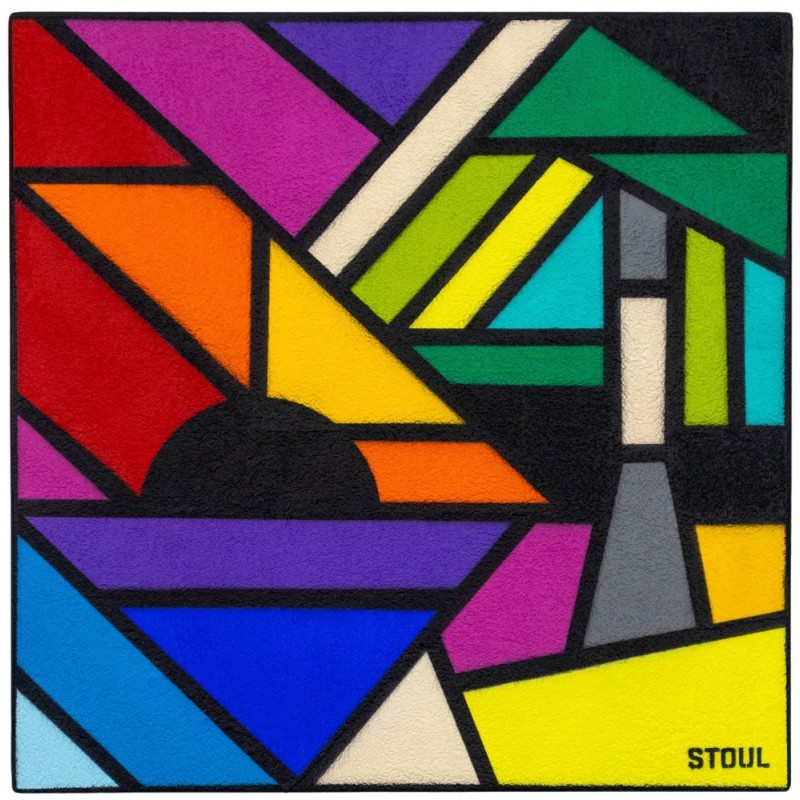 « Destination Plage » Avec cette série, Stoul explore des paysages de bord de mer en fragments abstraits. Chaque œuvre évoque une sensation estivale : rochers, dunes, blockhaus, soleil couchant... À travers son style géométrique et coloré, elle transforme ses souvenirs de plages en compositions sensibles et architecturées.