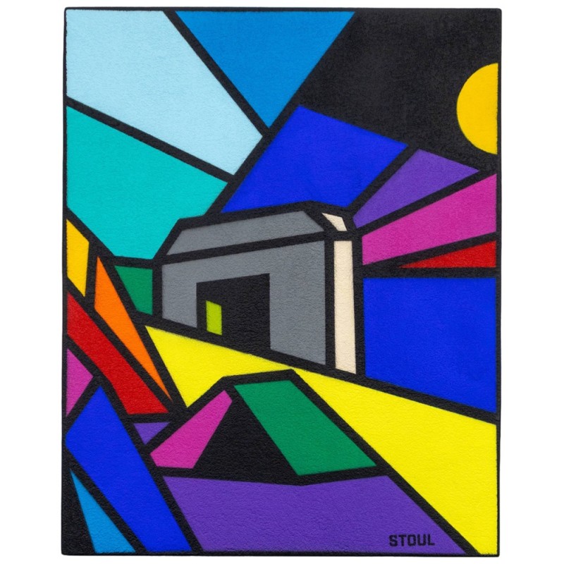 « Destination Plage » Avec cette série, Stoul explore des paysages de bord de mer en fragments abstraits. Chaque œuvre évoque une sensation estivale : rochers, dunes, blockhaus, soleil couchant... À travers son style géométrique et coloré, elle transforme ses souvenirs de plages en compositions sensibles et architecturées.