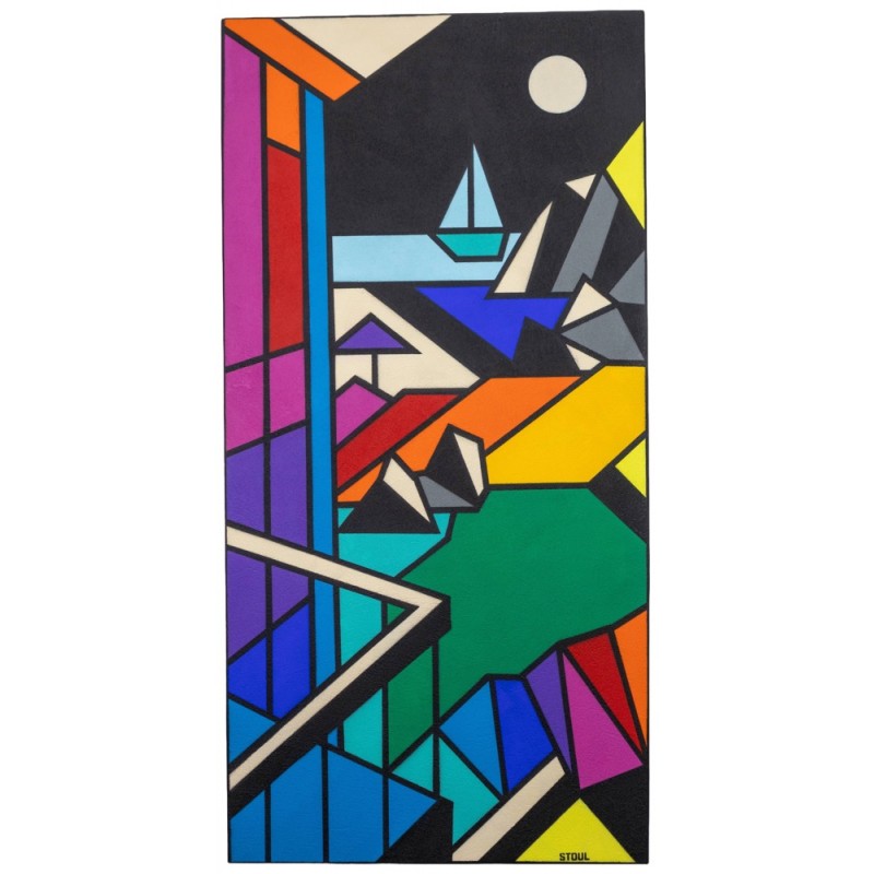 « Destination Plage » Avec cette série, Stoul explore des paysages de bord de mer en fragments abstraits. Chaque œuvre évoque une sensation estivale : rochers, dunes, blockhaus, soleil couchant... À travers son style géométrique et coloré, elle transforme ses souvenirs de plages en compositions sensibles et architecturées.
