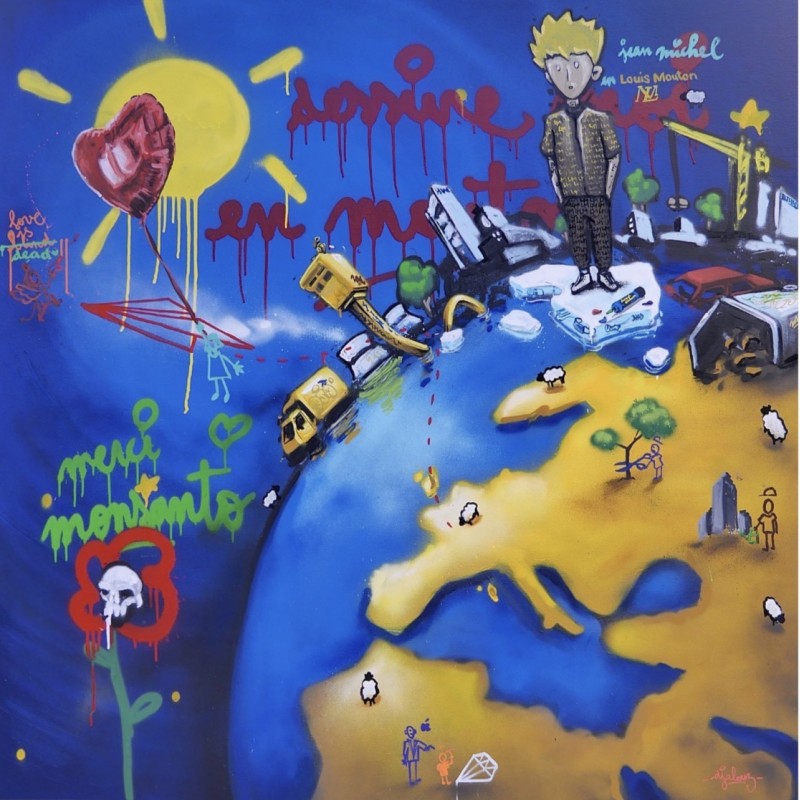 Dernièrement, dans sa série de dessins « Je d’enfant, dessine-moi un mouton », il esquisse les maux du monde à travers un regard enfantin. Sous l’apparente simplicité du trait se cache en réalité de multiples références qui questionnent le monde qui nous entoure et de l’actualité souvent brutale : la guerre, les flux migratoires, la pollution, l’écologie, la surveillance…