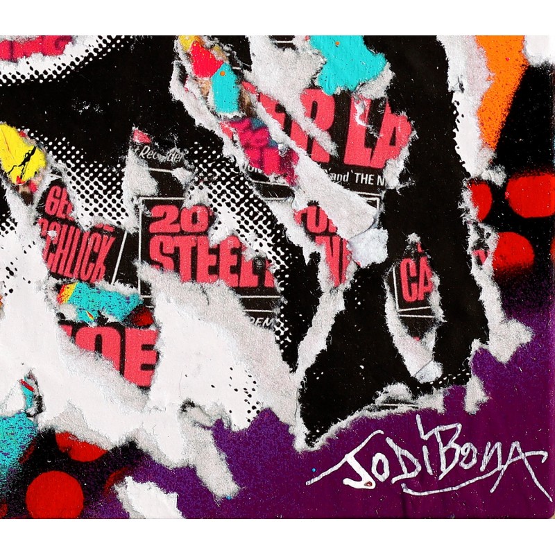 Dans cette interprétation contemporaine de la célèbre Mona Lisa, Jo Di Bona confronte l’icône de l’histoire de l’art à l’esthétique du street art. Le portrait apparaît au cœur d’un ensemble de collages, de typographies et d’éclats de couleurs vives, qui rappellent les murs urbains recouverts d’affiches et de graffitis.
