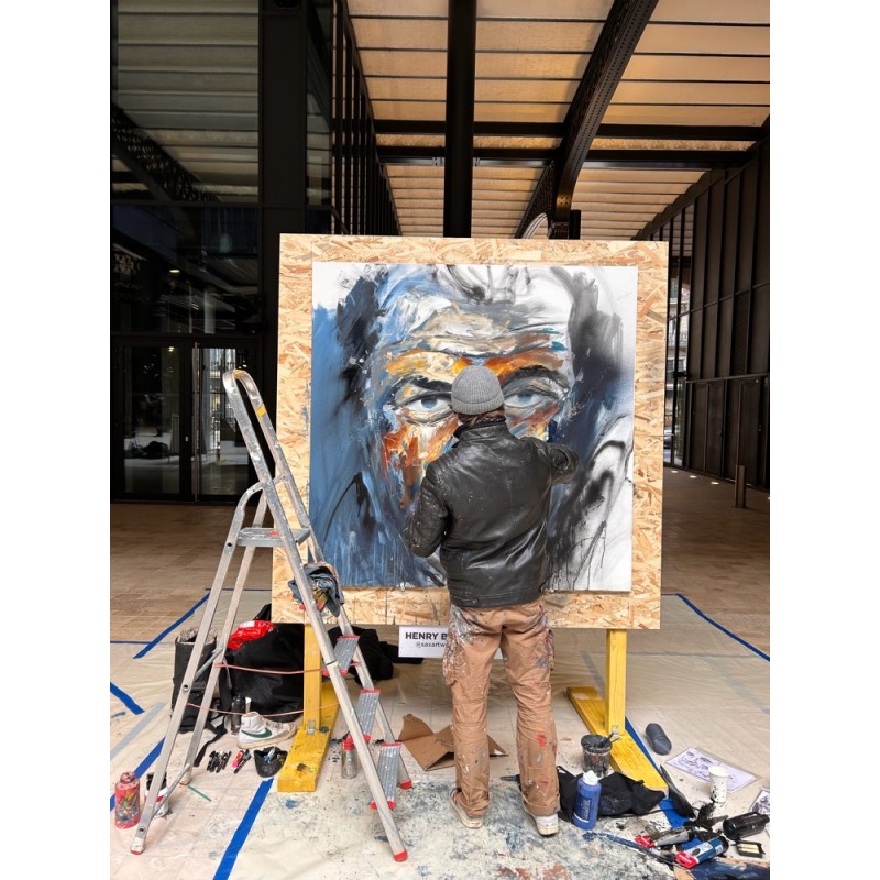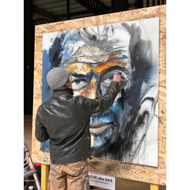 Réalisée en live pendant le festival de la Galerie Roussard à la Poste du Louvre en novembre 2025, l’œuvre conserve la spontanéité et l’intensité du moment de création, sous les yeux des visiteurs. La palette d’ocres, de noirs et de touches rouges et bleues renforce le caractère et la profondeur du portrait.