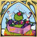 Il peint sur différents supports, toiles, murs, encombrants, un univers mêlant cette iconographie médiévale à des références plus contemporaines comme celle des jeux vidéos avec lesquels il a grandi.