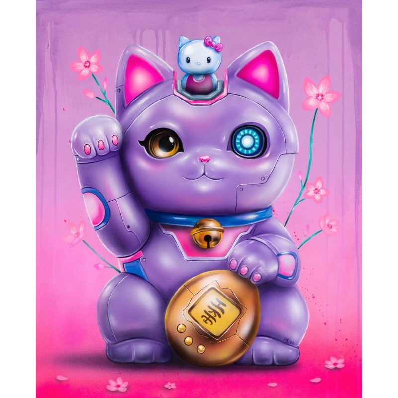 (Kaldea has replaced the traditional gold coin of the maneki-neko with a Tamagotchi. The artist suggests that our modern happiness now depends on our interaction with technology.)