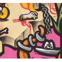 He paints on different supports, canvases, walls, bulky, a universe combining this medieval iconography with more contemporary references such as that of the video games with which he grew up.