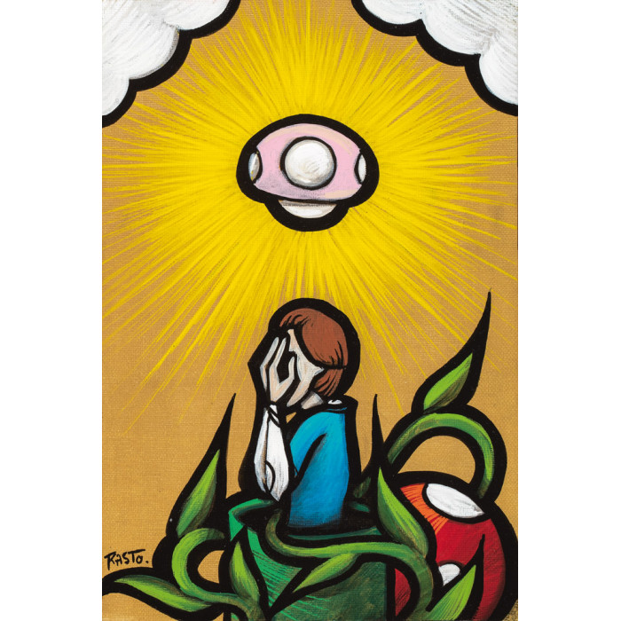 He paints on different supports, canvases, walls, bulky, a universe combining this medieval iconography with more contemporary references such as that of the video games with which he grew up.