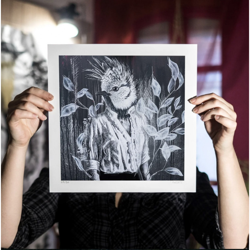 Her studio work is an extension of her Street Art practice: on her canvases, designed as portraits of her anthropomorphic birds, she pushes her technique to its climax. By posing models that she photographs, the digital tool is a prerequisite serving as a reference before painting on easels. Altered, aged backgrounds, worked with acrylic and aerosol, often adorned with stenciled patterns inspired by traditional South Indian art, recreate the ideal wall, the setting that will welcome the presence of its migrants. . Then India ink and oil paint are worked on for hours: with a certain obsession she paints until she fully feels the personality of the bird on the canvas, until she feels its song quivering under the feathers ...
