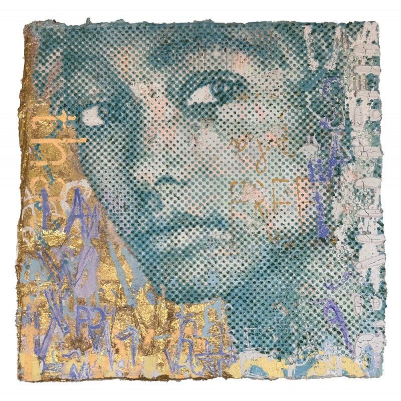 Through a three-dimensional dot pattern, she transforms portraits of women into powerful symbols of strength and dignity. Instead of traditional canvases, she uses recycled materials such as shipping crates, cardboard boxes, burlap sacks, and military tents. In a complex process involving 15 to 20 layers, she applies pigments to layers of mortar and plaster, creating relief surfaces that exist somewhere between painting and sculpture.