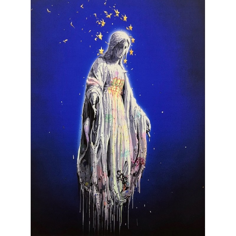 Brusk was born in Lyon in 1976. He is first and foremost a lover of drawing. It was in 1991 that this love led him to graffiti and its subversive world. Brusk is a multifaceted artist, working as a graffiti artist, muralist, painter, draftsman, sculptor, but above all, a storyteller of a world adrift, whose suffering and injustices he sublimates through an explosive and impactful aesthetic. Brusk's creativity has constantly evolved since 1991, but it is clear that the artist's style is marked by the use of two techniques that are almost omnipresent in his work: dripping and tearing, which very often fragment the representation of the world that the artist presents to us. From this alteration of the motif through tears and drips emerges a lightness and gentleness that reveal a world in which it seems possible to soften, to reconcile, to love, and even to hope for the advent of a better world. An ambiguity arises between a colorful and luminous form and a rebellious, acidic, sometimes even very dark background—a statement that denounces the dysfunctions of our modern societies, an inner revolt that transforms the ugliness of this world into an explosion of beauty, a true pictorial oxymoron that restores our hope. To reduce Brusk's work to tears and drips would therefore be a mistake, since the artist finely crafts a universe that is both light and brutal, aptly confronts nature and culture, and compels us to grasp the monstrosity of our world with a benevolent gaze free from all negativity. Brusk is an essential artist on the street art scene, who enjoys widespread recognition in the art market.