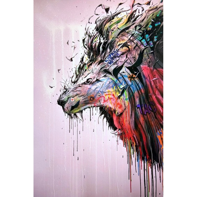 Brusk was born in Lyon in 1976. He is first and foremost a lover of drawing. It was in 1991 that this love led him to graffiti and its subversive world. Brusk is a multifaceted artist, working as a graffiti artist, muralist, painter, draftsman, sculptor, but above all, a storyteller of a world adrift, whose suffering and injustices he sublimates through an explosive and impactful aesthetic. Brusk's creativity has constantly evolved since 1991, but it is clear that the artist's style is marked by the use of two techniques that are almost omnipresent in his work: dripping and tearing, which very often fragment the representation of the world that the artist presents to us. From this alteration of the motif through tears and drips emerges a lightness and gentleness that reveal a world in which it seems possible to soften, to reconcile, to love, and even to hope for the advent of a better world. An ambiguity arises between a colorful and luminous form and a rebellious, acidic, sometimes even very dark background—a statement that denounces the dysfunctions of our modern societies, an inner revolt that transforms the ugliness of this world into an explosion of beauty, a true pictorial oxymoron that restores our hope. To reduce Brusk's work to tears and drips would therefore be a mistake, since the artist finely crafts a universe that is both light and brutal, aptly confronts nature and culture, and compels us to grasp the monstrosity of our world with a benevolent gaze free from all negativity. Brusk is an essential artist on the street art scene, who enjoys widespread recognition in the art market.