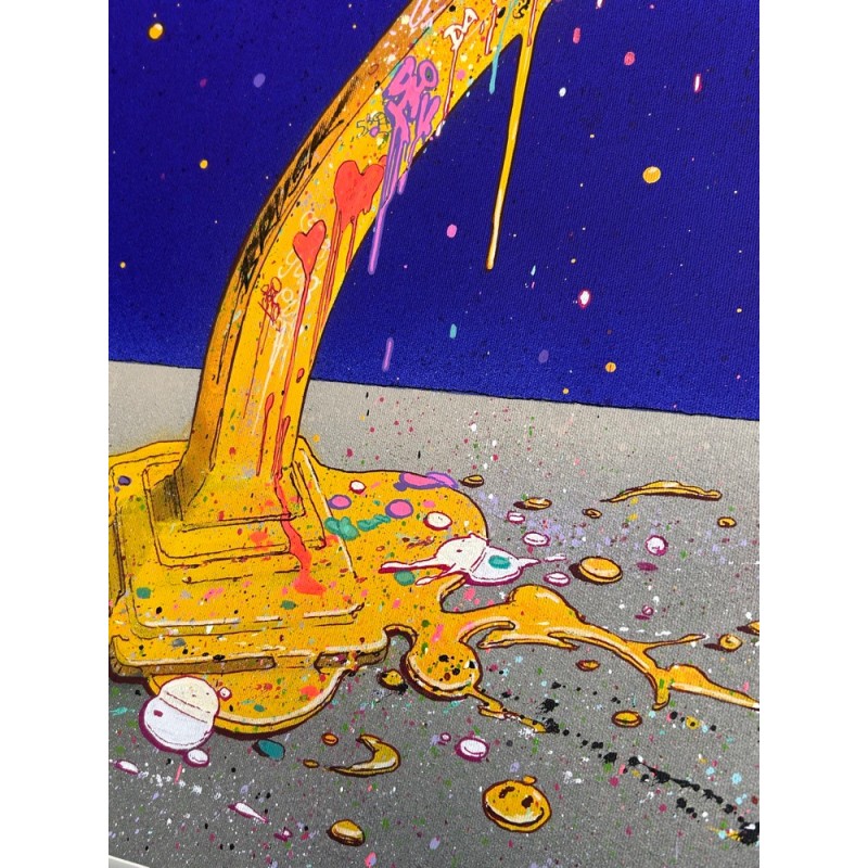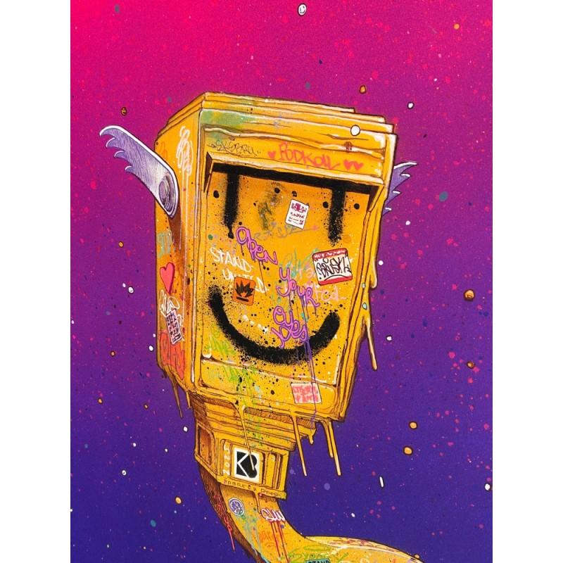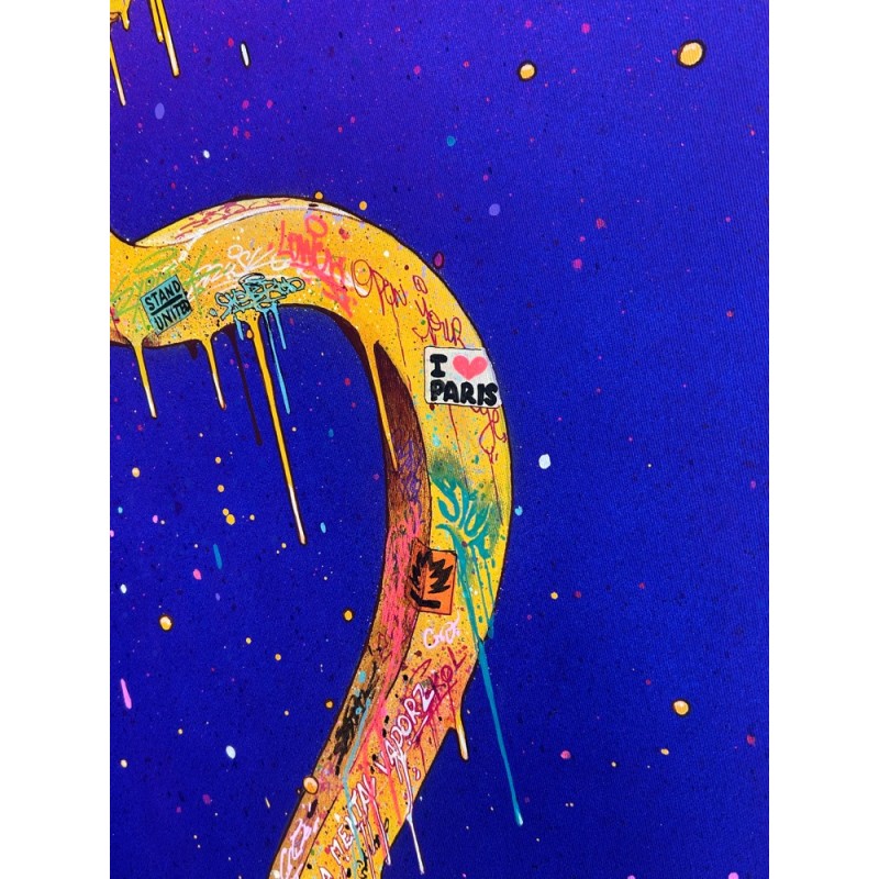 Brusk was born in Lyon in 1976. He is first and foremost a lover of drawing. It was in 1991 that this love led him to graffiti and its subversive world. Brusk is a multifaceted artist, working as a graffiti artist, muralist, painter, draftsman, sculptor, but above all, a storyteller of a world adrift, whose suffering and injustices he sublimates through an explosive and impactful aesthetic. Brusk's creativity has constantly evolved since 1991, but it is clear that the artist's style is marked by the use of two techniques that are almost omnipresent in his work: dripping and tearing, which very often fragment the representation of the world that the artist presents to us. From this alteration of the motif through tears and drips emerges a lightness and gentleness that reveal a world in which it seems possible to soften, to reconcile, to love, and even to hope for the advent of a better world. An ambiguity arises between a colorful and luminous form and a rebellious, acidic, sometimes even very dark background—a statement that denounces the dysfunctions of our modern societies, an inner revolt that transforms the ugliness of this world into an explosion of beauty, a true pictorial oxymoron that restores our hope. To reduce Brusk's work to tears and drips would therefore be a mistake, since the artist finely crafts a universe that is both light and brutal, aptly confronts nature and culture, and compels us to grasp the monstrosity of our world with a benevolent gaze free from all negativity. Brusk is an essential artist on the street art scene, who enjoys widespread recognition in the art market.