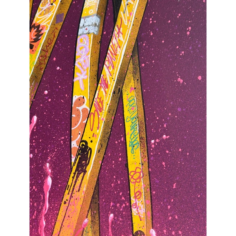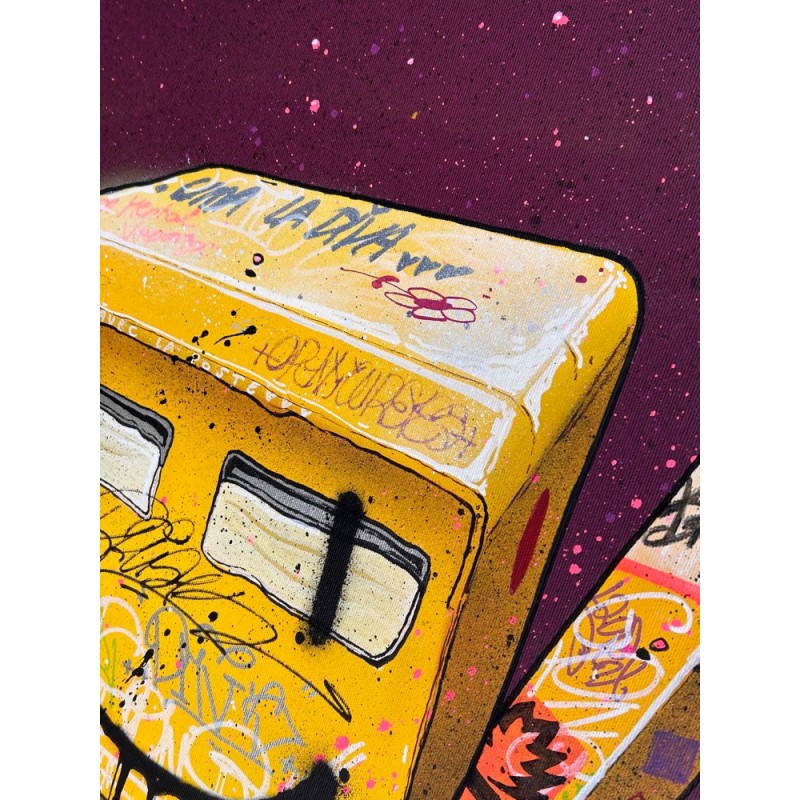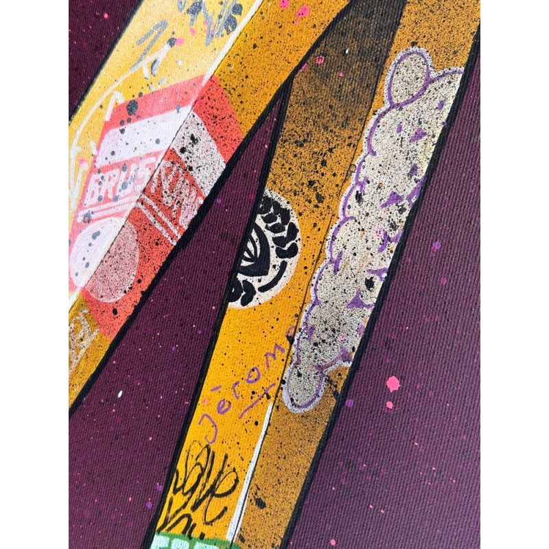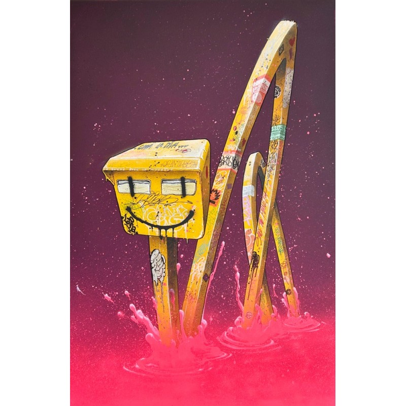 Brusk was born in Lyon in 1976. He is first and foremost a lover of drawing. It was in 1991 that this love led him to graffiti and its subversive world. Brusk is a multifaceted artist, working as a graffiti artist, muralist, painter, draftsman, sculptor, but above all, a storyteller of a world adrift, whose suffering and injustices he sublimates through an explosive and impactful aesthetic. Brusk's creativity has constantly evolved since 1991, but it is clear that the artist's style is marked by the use of two techniques that are almost omnipresent in his work: dripping and tearing, which very often fragment the representation of the world that the artist presents to us. From this alteration of the motif through tears and drips emerges a lightness and gentleness that reveal a world in which it seems possible to soften, to reconcile, to love, and even to hope for the advent of a better world. An ambiguity arises between a colorful and luminous form and a rebellious, acidic, sometimes even very dark background—a statement that denounces the dysfunctions of our modern societies, an inner revolt that transforms the ugliness of this world into an explosion of beauty, a true pictorial oxymoron that restores our hope. To reduce Brusk's work to tears and drips would therefore be a mistake, since the artist finely crafts a universe that is both light and brutal, aptly confronts nature and culture, and compels us to grasp the monstrosity of our world with a benevolent gaze free from all negativity. Brusk is an essential artist on the street art scene, who enjoys widespread recognition in the art market.