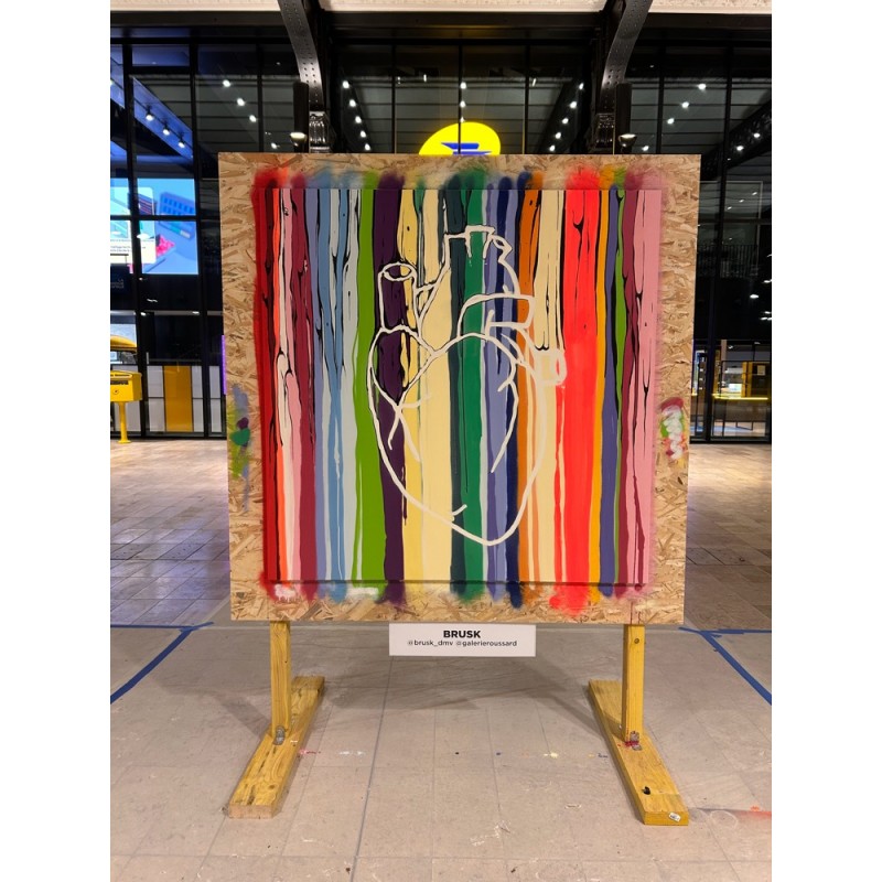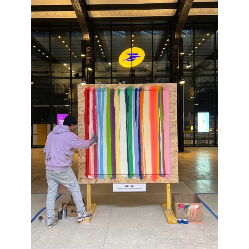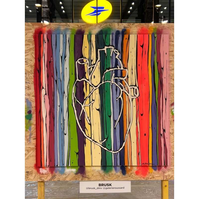Brusk was born in Lyon in 1976. He is first and foremost a lover of drawing. It was in 1991 that this love led him to graffiti and its subversive world. Brusk is a multifaceted artist, working as a graffiti artist, muralist, painter, draftsman, sculptor, but above all, a storyteller of a world adrift, whose suffering and injustices he sublimates through an explosive and impactful aesthetic. Brusk's creativity has constantly evolved since 1991, but it is clear that the artist's style is marked by the use of two techniques that are almost omnipresent in his work: dripping and tearing, which very often fragment the representation of the world that the artist presents to us. From this alteration of the motif through tears and drips emerges a lightness and gentleness that reveal a world in which it seems possible to soften, to reconcile, to love, and even to hope for the advent of a better world. An ambiguity arises between a colorful and luminous form and a rebellious, acidic, sometimes even very dark background—a statement that denounces the dysfunctions of our modern societies, an inner revolt that transforms the ugliness of this world into an explosion of beauty, a true pictorial oxymoron that restores our hope. To reduce Brusk's work to tears and drips would therefore be a mistake, since the artist finely crafts a universe that is both light and brutal, aptly confronts nature and culture, and compels us to grasp the monstrosity of our world with a benevolent gaze free from all negativity. Brusk is an essential artist on the street art scene, who enjoys widespread recognition in the art market.